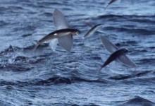 二、生活习性 1、环境:飞鱼是暖水鱼类,常集群活动于海洋上层,遭到攻击或受到刺激时能跃出水面十几米,“飞行”距离最远可达400多米。 |